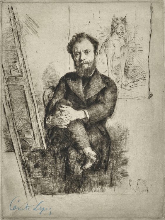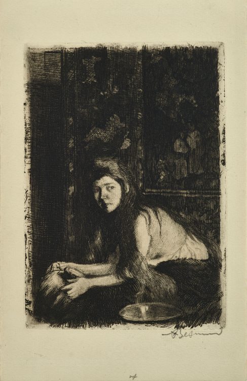 Another close collaboration is revealed by two etchings of the same scene. Anders Zorn, a Swedish artist who lived in Paris for several years, captured his friend Albert Besnard in the act of drawing a female model. The same composition appears in Besnard’s print La Femme au vase. While Zorn’s etching is lively and sketchlike, Besnard’s presents a darker view, steeped in shadowy aquatint.