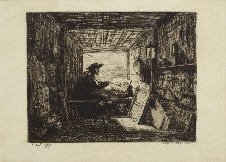 The practice of working out of doors to create landscape sketches and studies to be later worked up in the studio is a long established one. An early example from the Katrin Bellinger collection is Lambert Doomer’s draughtsman sketching by a tree of circa 1660, where he captures a colleague working out of doors. An Italian drawing, Remigio Cantagallina’s artist walking and sketching in a landscape, is another early example.
