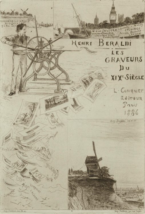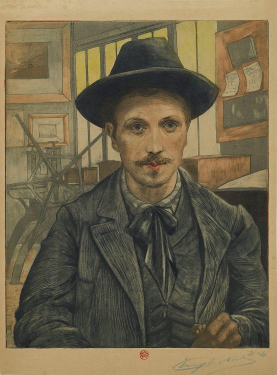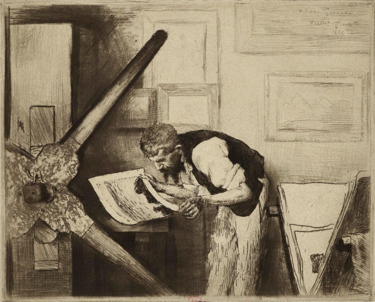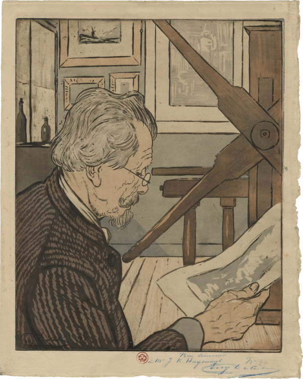 Increasingly, artists were involved in the actual process of printing their works: inking and paper selection were often done in close collaboration with master printers like Auguste Delâtre, captured at his press by Maximilien Luce. Delâtre is also the subject of a color etching by his son Eugène; notably, the impression in the collection is dedicated to the renowned writer Joris-Karl Huysmans. Henri Guérard, another printmaker who worked closely with Manet and the Impressionists, carefully inspects a print in an etching by his friend Norbert Goeneutte. Guérard would return the favor in his own portrayal of Goeneutte, Norbert Goeneutte á l’étude, Dieppe.